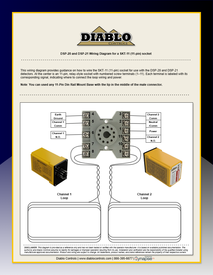 This article provides a wiring diagram to guide the installation of a DSP-21 and DSP-20 loop detector with a SKT-11 socket.