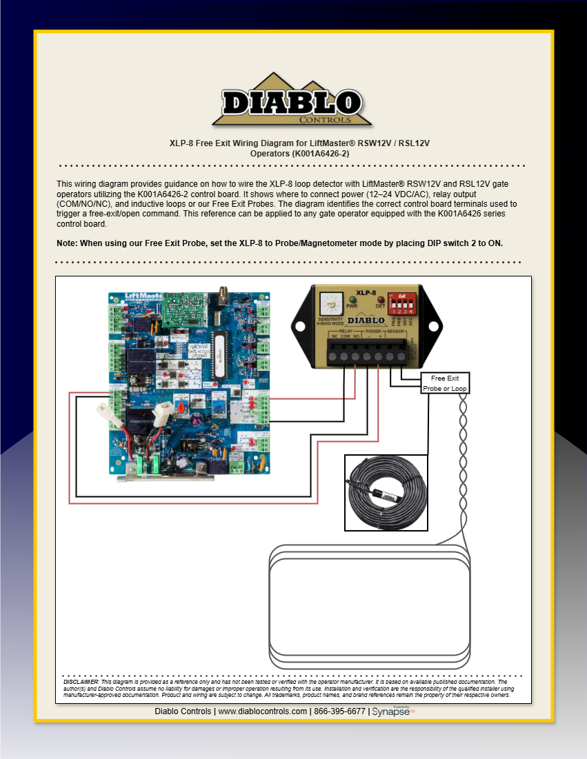 This article provides a wiring diagram to guide the installation of an XLP-8 loop detector with a LiftMaster RSW12V and RSL12V operator, or any operator that uses a K001A6426-2 board.