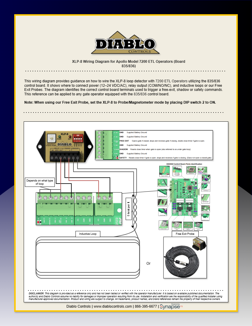 This article provides a wiring diagram to guide the installation of an XLP-8 loop detector with a LiftMaster Model 7200 ETL operator, or any operator that uses an 835/836 board.