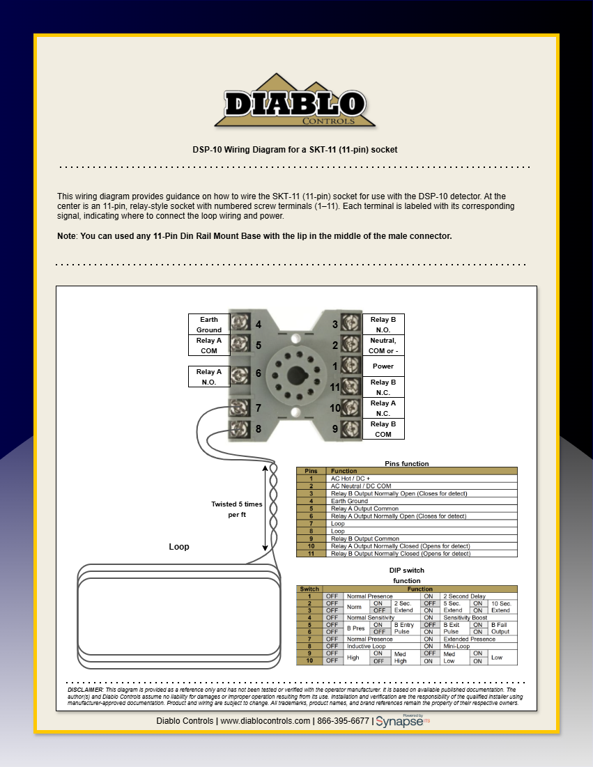 This article provides a wiring diagram to guide the installation of a DSP-10 loop detector with a SKT-11 socket.
